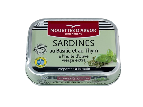 Covered with an extra virgin first cold pressed olive oil, the sardines benefit from the tasty alliance of basil and thyme that brings a note of freshness.